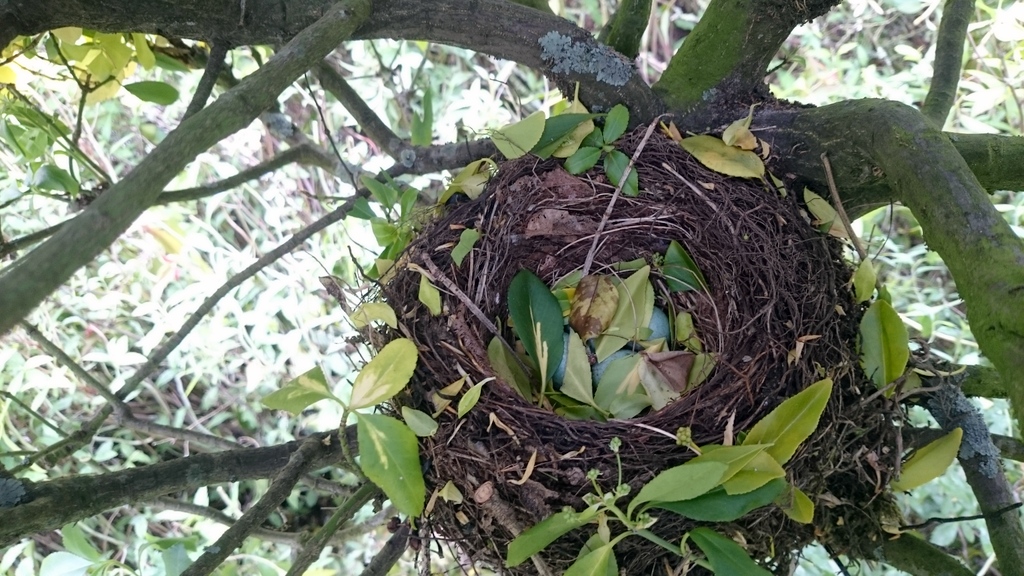 Mijn moeder was bang dat de eitjes te koud zouden worden, dus we wilden de moeder niet te lang van het nest laten, maar er waren nu diverse blaadjes op de eitjes gevallen. Hoe zou ze daar mee omgaan? Geen nood: ze vloog af en aan met de blaadjes in de snavel die ze vervolgens ergens anders liet vallen. Opgeruimd staat netjes.