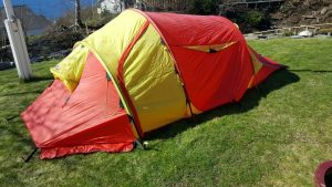 Gert vertelde dat hij de tent had geïmpregneerd want vorig jaar tij-dens onze vakantie merkten we dat er her en der regen doorheen druppelde. We hebben de tent intensief gebruikt, en zullen dat deze zomer ook weer doen als we weer in Noord Noorwegen gaan wandelen. Maar dan wel graag droog.