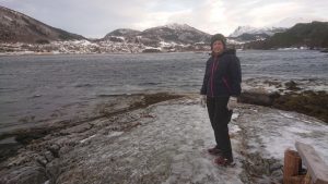Na het eten reden we naar de overnachtingsplek. Ik heb goed geslapen. De volgende ochtend reden we naar de Atlanterhavsweg waar we in de kiosk zouden ontbijten. Het was mooi weer; de zon kwam net op. Na het ontbijt liepen we een rondje om de berg heen, vlak langs het water.