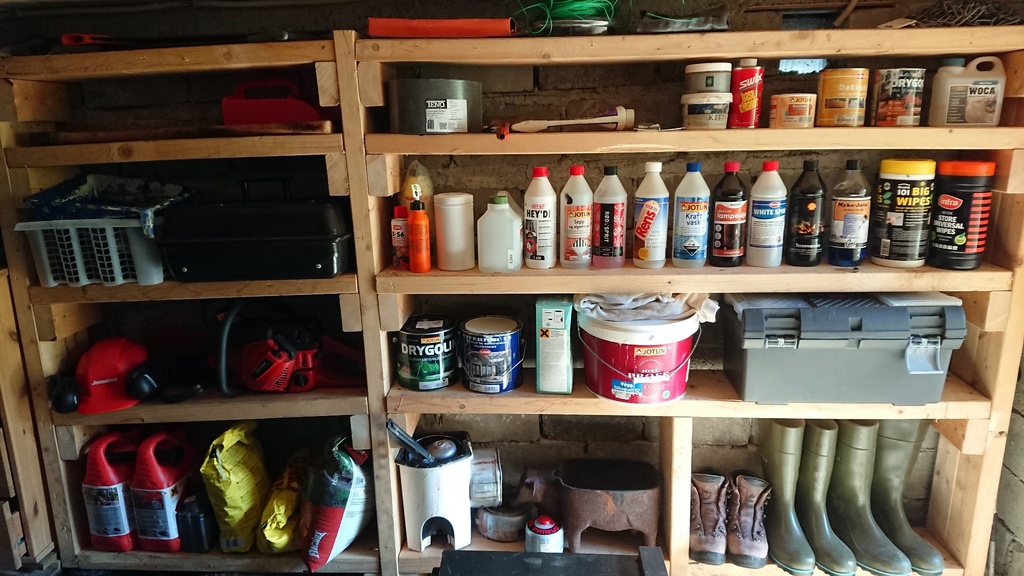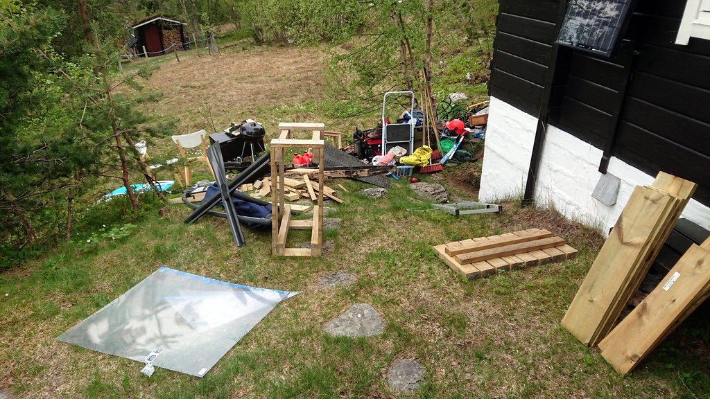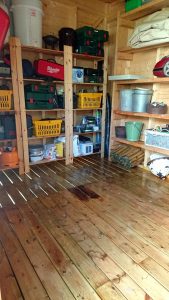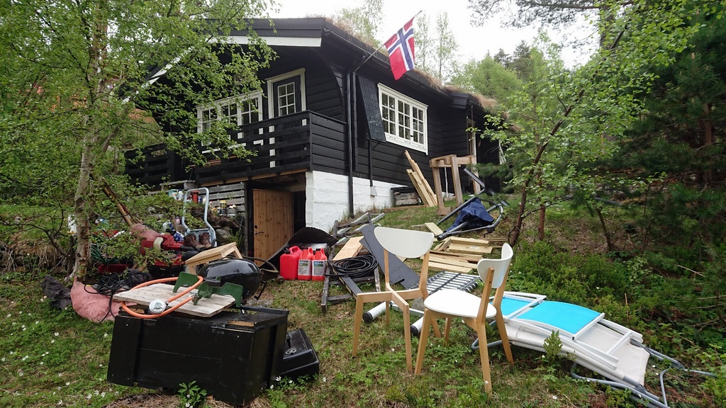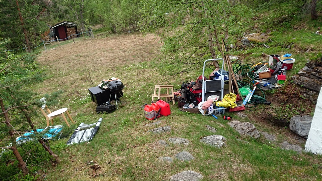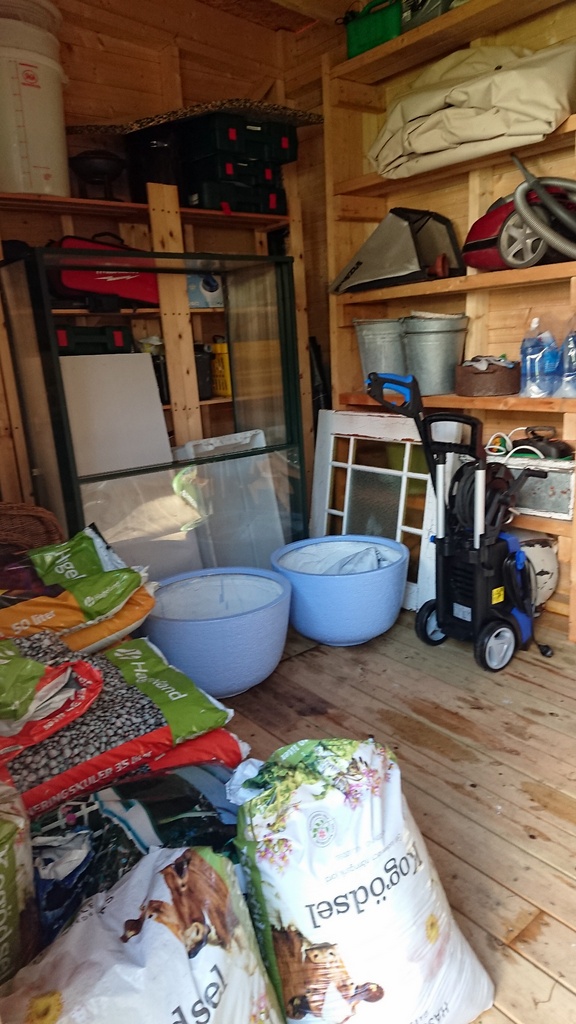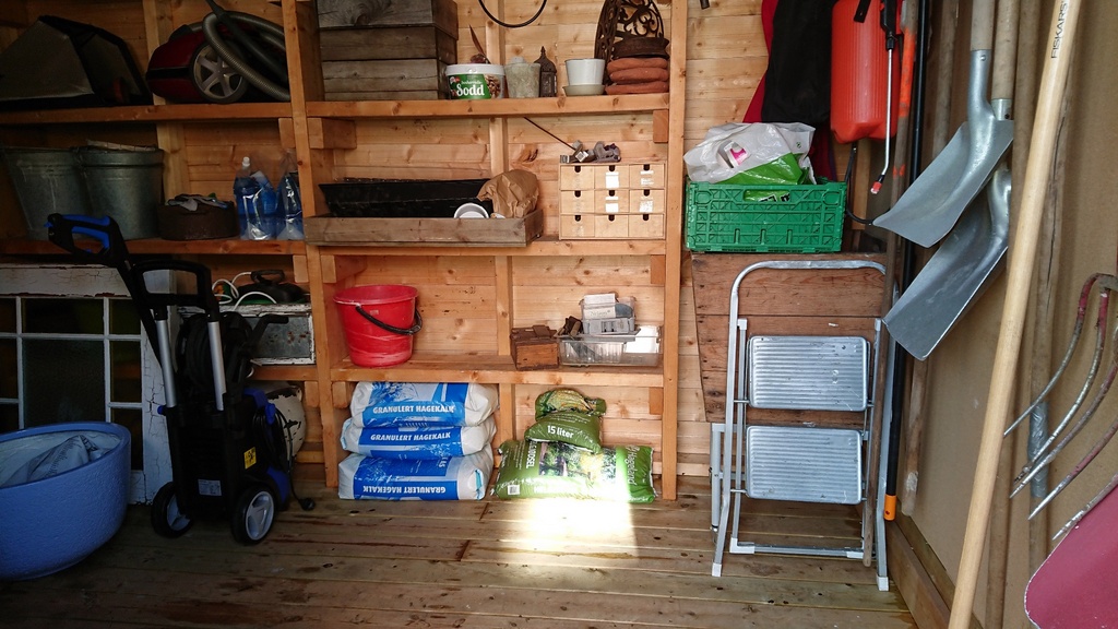 We blijven niet erg lang meer in Jønsbu, want thuis willen we ook nog het een en ander gaan doen. Daar aangekomen zijn de planten erg droog, die voorzie ik van een grote plens met water. Gert neemt de schuur eens onderhanden: alles eruit, schuur schoonmaken en alles er weer in.