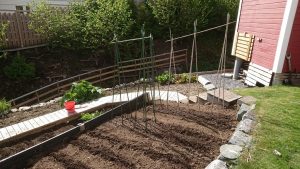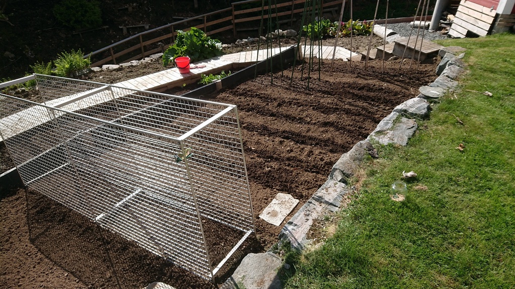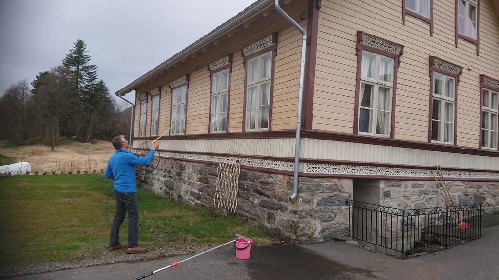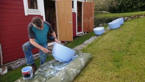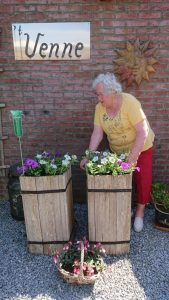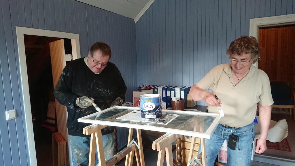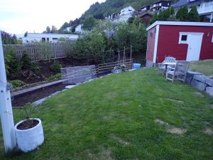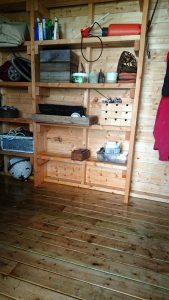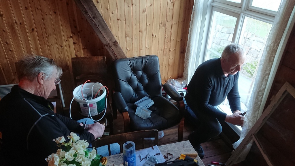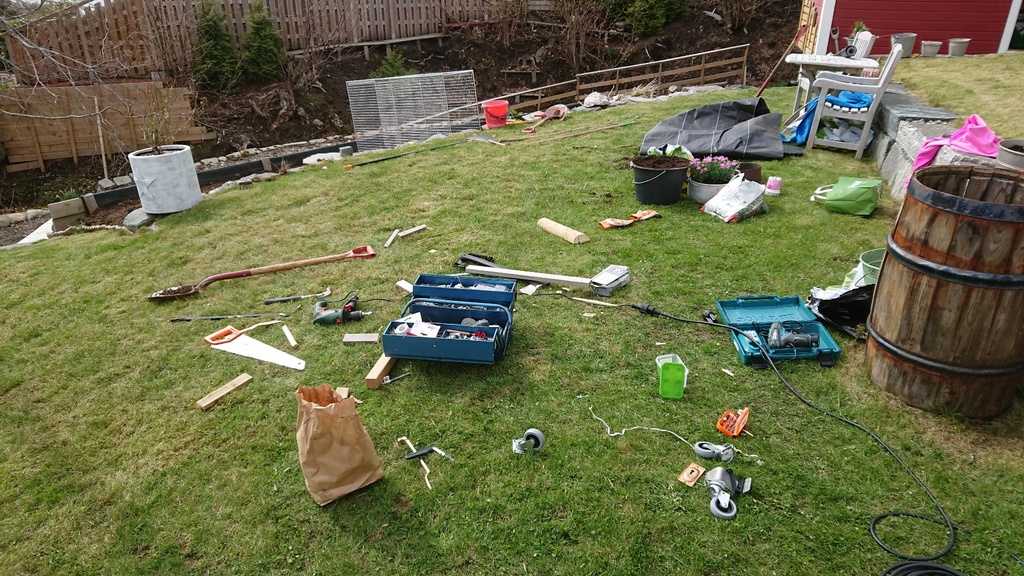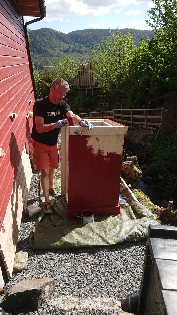 We blijven niet erg lang meer in Jønsbu, want thuis willen we ook nog het een en ander gaan doen. Daar aangekomen zijn de planten erg droog, die voorzie ik van een grote plens met water. Gert neemt de schuur eens onderhanden: alles eruit, schuur schoonmaken en alles er weer in.