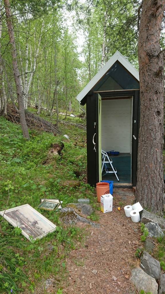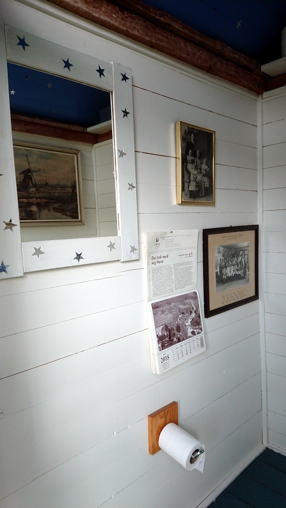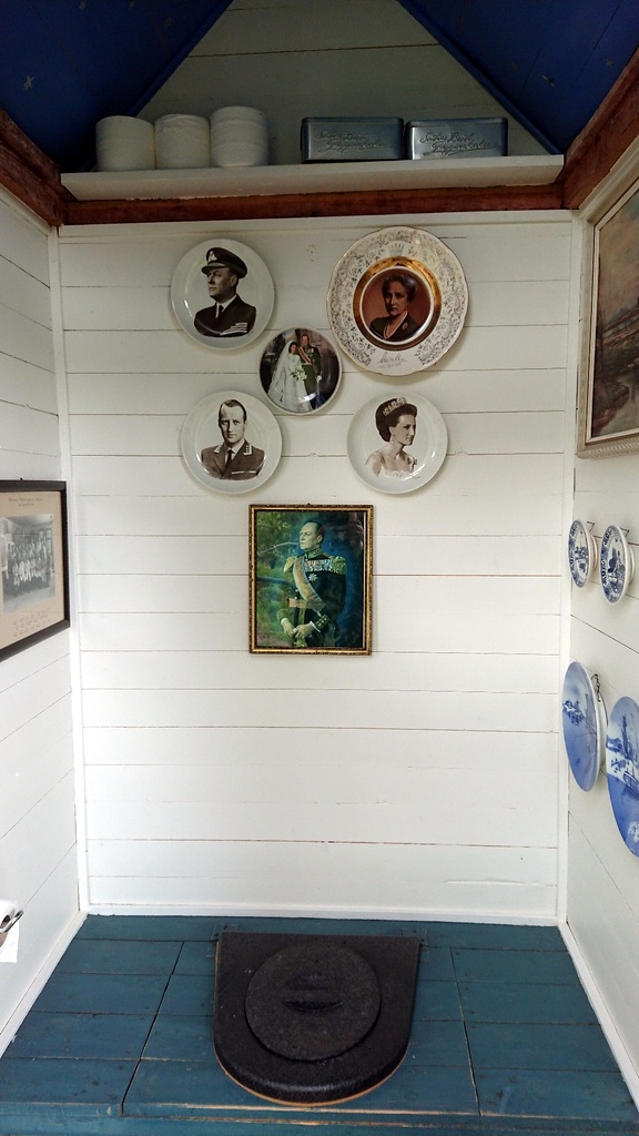 In Noorwegen is het verder gebruikelijk om de Koninklijke familie op te hangen aan de toiletwand. Dat heeft een historische betekenis. Vroeger had men geen wc-papier en werd het achterwerk met kranten- og weekbladpapier afgeveegd. Maar foto’s van de koninklijke leden werden eruit gescheurd en opgehangen aan de wand want het werd als respectloos gezien als je na toiletgang bijv. de koning gebruikte voor dat doel. Ik heb geen foto’s maar wel allerlei bordjes verzamelt met elden van de koninklijke familie erop. En die hangen op de achterwand.