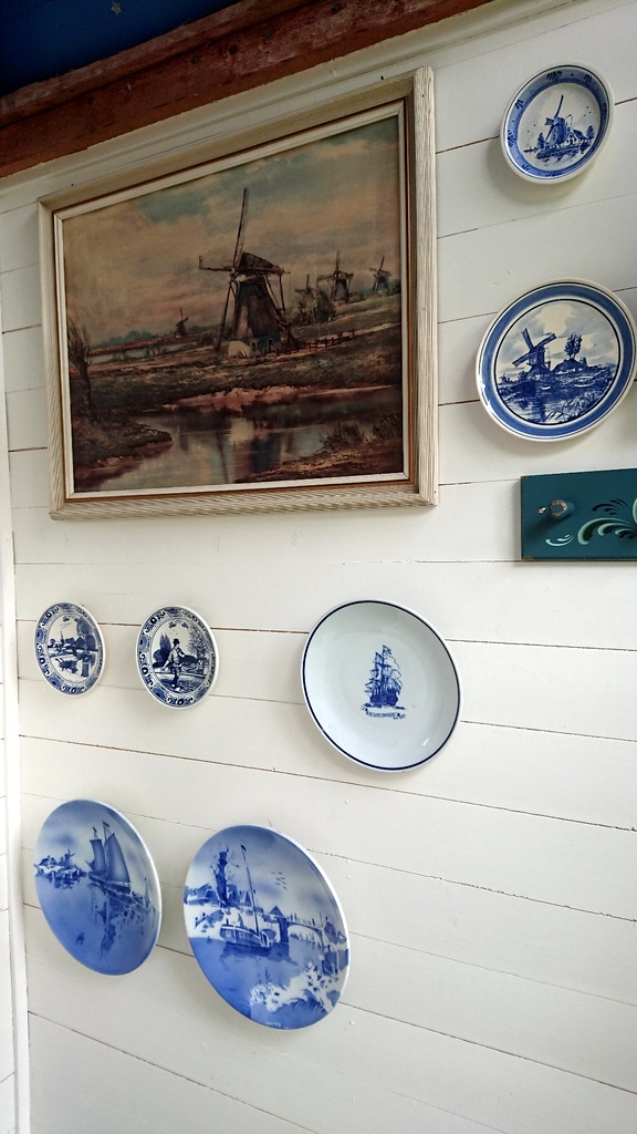 Ik vind dat we een gezellig toiletje hebben: met foto’s, schilderijen, tegeltjes en bordjes in Delfts blauw.