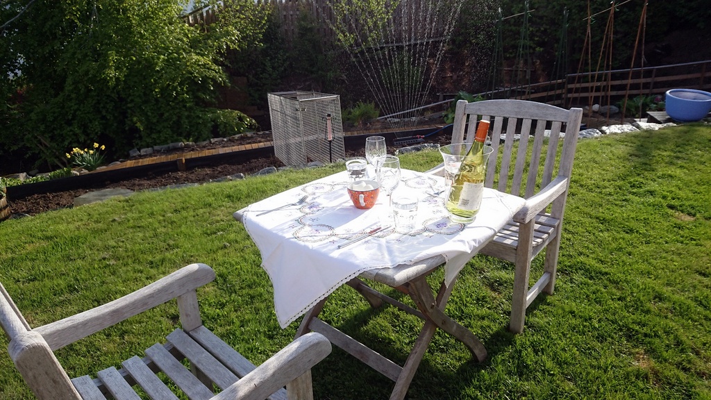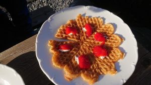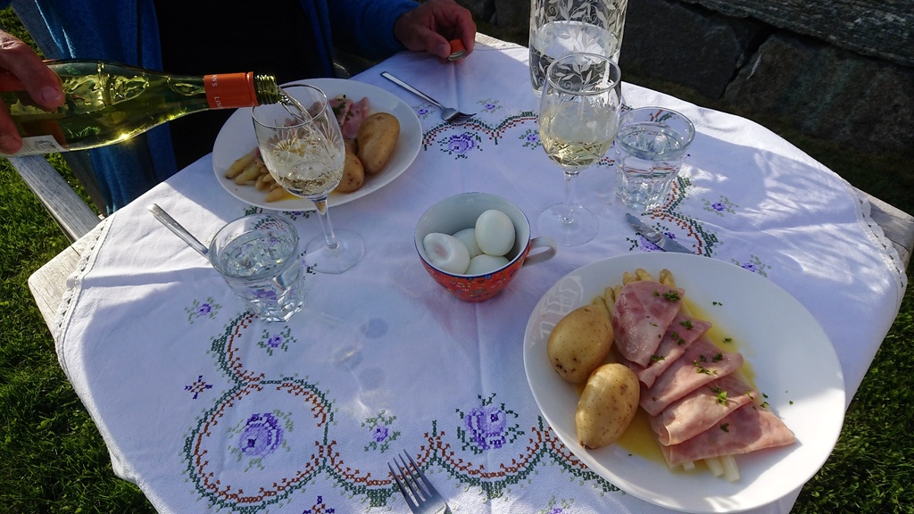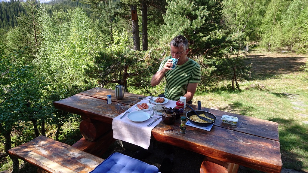 Tweede pinksterdag is he took heel er gmooi weer. We nuttigen een heelrijk ontbijt metz alm en roerei buiten aan de tafel.
