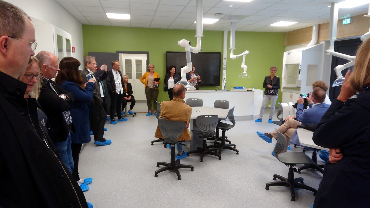Hilde, de schoolchef, leidde ons rond. Het is echt een geweldig gebouw geworden met veel verschillende knallende kleuren. De politici waren echt onder de indruk. Er was er zelfs eentje die zei echt jaloers te zijn. Deze foto is gemaakt in het scheikundelokaal.